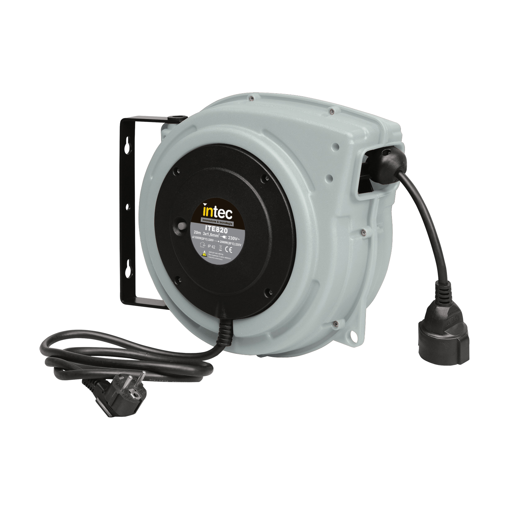 Arrotolatore professionale ITE820 con 20 m di cavo tripolare e prese Schuko alle estremità . Cavo antiolio per utilizzo intensivo tipo H07RN-F.